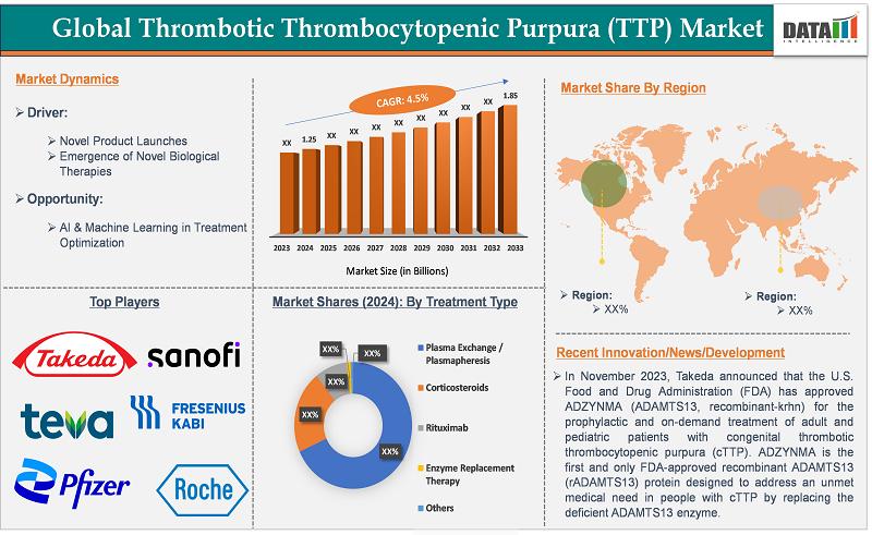According to DataM Intelligence, the global Thrombotic Thrombocytopenic Purpura (TTP) market size reached US$ 1.25 billion in 2024 and is expected to reach US$ 1.85 billion by 2033, growing at a CAGR of 4.5% during 2025-2033, driven by increasing diagnosis rates of acquired and inherited TTP, strong adoption of plasma exchange and caplacizumab therapies, growing use of rituximab and corticosteroids, expanding specialty clinic infrastructure, and rising investments in rare hematologic…