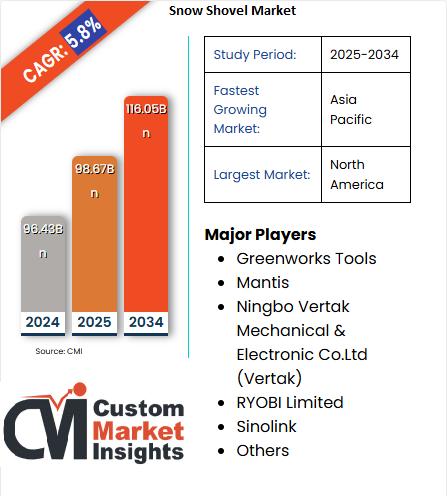 Global Snow Shovel Market is expected to reach USD 98.67 Billion in 2025 and expected to reach USD 116.05 Billion by 2034, with a CAGR of 5.8% between 2025 and 2034.➤ Request Free Sample PDF Report @ https://www.custommarketinsights.com/request-for-free-sample/?reportid=67211