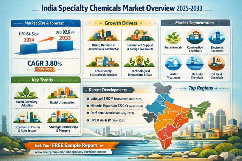 India Specialty Chemicals Industry Overview: 2025-2033According to IMARC Group's report titled "India Specialty Chemicals Market Size, Share, Trends and Forecast by Type, and Region, 2025-2033" the report offers a comprehensive analysis of the industry, including market share, growth, trends, and regional insights.