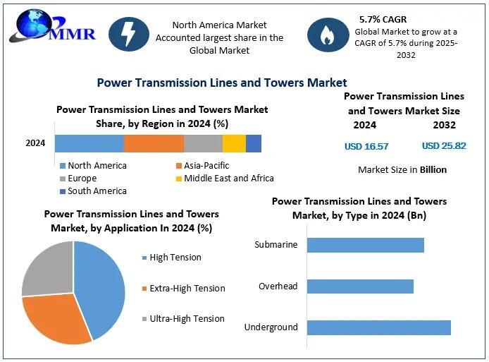Power Transmission Lines and Towers Market size was valued at USD 16.57 Bn. in 2024 and is expected to reach USD 25.82 Bn. by 2032, at a CAGR of 5.7% from forecast 2025 to 2032.