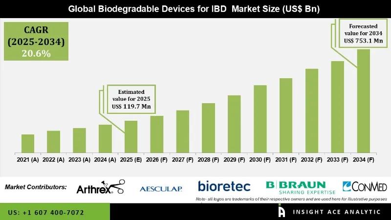 InsightAce Analytic Pvt. Ltd. announces the release of a market assessment report on the "Global Biodegradable Devices for IBD Market Size, Share & Trends Analysis Report By Disease Type (Crohn's Disease and Ulcerative Colitis), By Product Type (Tissue Barriers, Wound Dressings, Drug Delivery Systems, Biodegradable Stents, Sutures / Staples, Implants & Patches, Anti-Adhesive, Scaffolds, Surgical Meshes, and Others), By Material Type (Polylactic Acid (PLA), Polyhydroxyalkanoates (PHA), Polyglycolic Acid (PGA), Polycaprolactone…