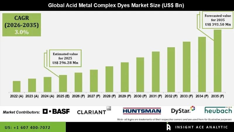 InsightAce Analytic Pvt. Ltd. announces the release of a market assessment report on the "Global Acid Metal Complex Dyes Market Size, Share & Trends Analysis Report By Type (Metal Complex Type (Chrome Complex Dyes, Zinc Complex Dyes, Copper Complex Dyes) and Dye Form (Liquid/Solution, Powder, Paste)), Application (Automotive, Apparel and Fashion, Home Furnishing, and Others), End-user (Textile Industry, Paper Industry, Leather Industry, and Others),-Market Outlook And Industry Analysis 2035"