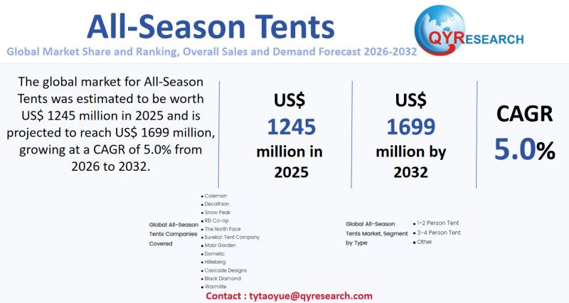 The global market for All-Season Tents was estimated to be worth US$ 1245 million in 2025 and is projected to reach US$ 1699 million, growing at a CAGR of 5.0% from 2026 to 2032.