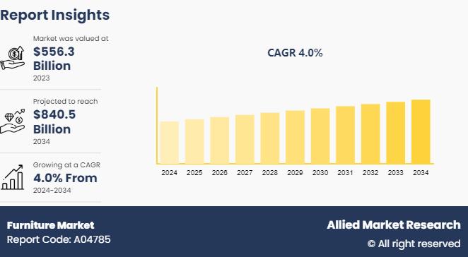 According to a new report published by Allied Market Research, titled, "furniture market" was valued at $556.3 billion in 2023, and is projected to reach $840.5 billion by 2034, growing at a CAGR of 4% from 2024 to 2034.