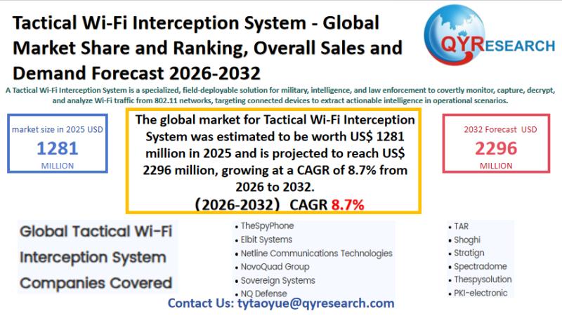 The global market for Tactical Wi-Fi Interception System was estimated to be worth US$ 1281 million in 2025 and is projected to reach US$ 2296 million, growing at a CAGR of 8.7% from 2026 to 2032.Global Leading Market Research Publisher QYResearch announces the release of its latest report "Tactical Wi-Fi Interception System - Global Market Share and Ranking, Overall Sales and Demand Forecast 2025-2031". Based on current situation and impact historical analysis (2020-2024) and forecast calculations (2025-2031), this report provides a comprehensive analysis of the global Tactical Wi-Fi Interception System market, including market size, share, demand, industry development status, and forecasts for the next few years.