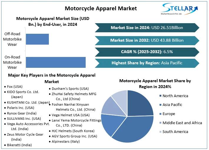 The Motorcycle Apparel Market size was valued at USD 26.51 Bn. in 2024 and the total Motorcycle Apparel Market revenue is expected to grow at a CAGR of 6.5% from 2025 to 2032, reaching nearly USD 43.88 Bn. by 2032.The motorcycle apparel market is an essential segment of the global automotive and lifestyle industry, focused on providing protective, functional, and stylish clothing for motorcycle riders. Motorcycle apparel includes jackets, helmets, gloves, boots, pants, body armor, and rainwear designed to enhance rider safety, comfort, and performance.