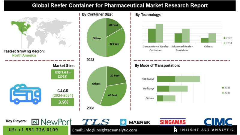 InsightAce Analytic Pvt. Ltd. announces the release of a market assessment report on the "Global Reefer Container for Pharmaceutical Market Size, Share & Trends Analysis Report By Container Size (20 Feet, 40 Feet, And High Cube), Mode Of Transportation (Roadways, Railways, And Seaways), And Technology (Conventional Reefer And Advanced Reefer), Region, Market Outlook And Industry Analysis 2031"The Global Reefer Container For Pharmaceutical Market is estimated to reach over USD 4.9 Bn by 2031, exhibiting a CAGR of 3.9% during the forecast period.