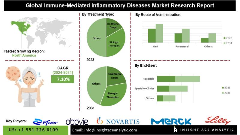 InsightAce Analytic Pvt. Ltd. announces the release of a market assessment report on the " Immune-Mediated Inflammatory Diseases Market - (By Treatment Type (Traditional Drugs, Biologic Therapies, Novel Therapies), Indication (Asthma, Chronic Obstructive Pulmonary Diseases (COPD), Inflammatory Bowel Disease (IBD), Systemic Lupus Erythematosus (SLE), Rheumatoid Arthritis (RA), Psoriasis, Others), By Route of Administration (Oral, Parenteral, Others), End-Users (Hospitals, Specialty Clinics, Others), Distribution Channel (Hospital Pharmacy, Retail Pharmacy, Others)), Trends, Industry…