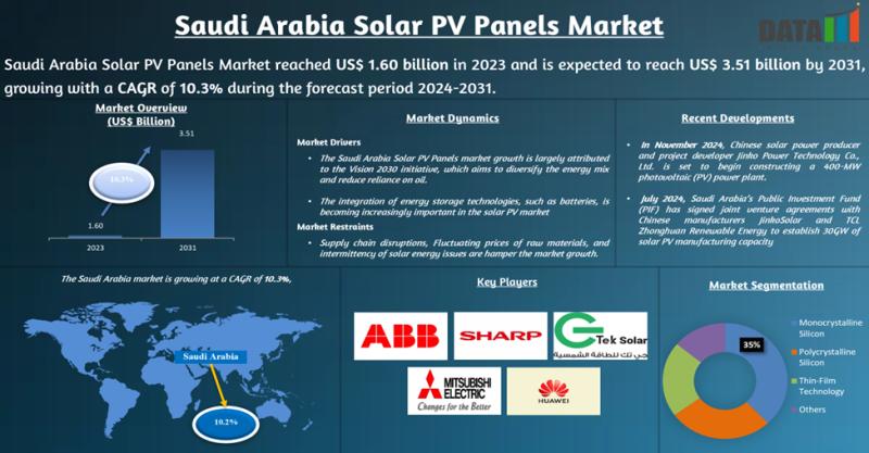 Leander, Texas and Tokyo, Japan - Jan.19.2026As per DataM intelligence research report "Saudi Arabia Solar PV Panels Market reached US$ 1.60 billion in 2023 and is expected to reach US$ 3.51 billion by 2031, growing with a CAGR of 10.3% during the forecast period 2024-2031."