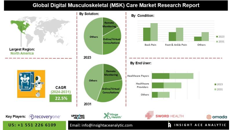 InsightAce Analytic Pvt. Ltd. announces the release of a market assessment report on the "Global Digital Musculoskeletal (MSK) Care Market Size, Share & Trends Analysis Report Solution (Online/Virtual Consultations, Pain Management Therapy Programs, Remote Monitoring, Others), Condition (Back Pain, Foot & Ankle Pain, Knee & Lower Leg Pain, Neck & Shoulder Pain, Pelvis, Hip & Thigh Pain, Others), End User (Healthcare Providers, Healthcare Payers, Employers, Individuals/Patients, Others)- Market Outlook And