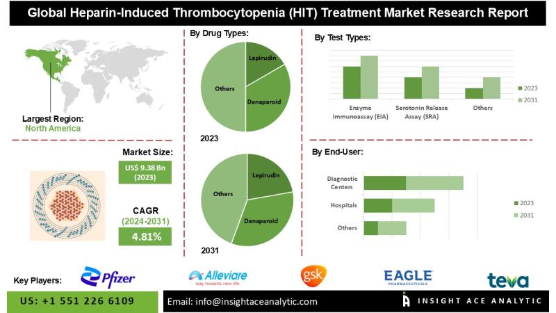 InsightAce Analytic Pvt. Ltd. announces the release of a market assessment report on the " Heparin-Induced Thrombocytopenia (HIT) Treatment Market - (By Drug Types (Lepirudin, Danaparoid, Argatroban), By Test Types (Enzyme Immunoassay (EIA), Serotonin Release Assay (SRA), Enzyme-Linked Immunosorbent Assay (ELISA), Heparin-Induced Platelet Activation (HIPA) Test), By End User (Hospitals, Diagnostic Centers, Specialized Clinics, Hospital Pharmacy, Home Care Setting, Mail Order Pharmacy)), Trends, Industry Competition Analysis, Revenue and Forecast To…