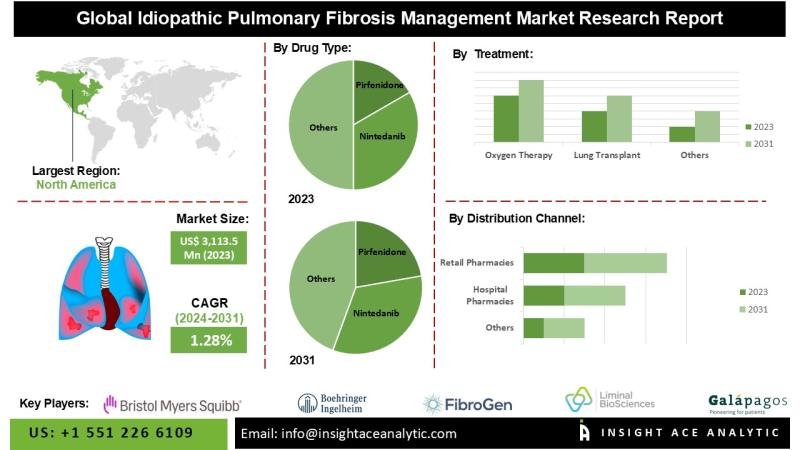 InsightAce Analytic Pvt. Ltd. announces the release of a market assessment report on the " Idiopathic Pulmonary Fibrosis Management Market - (By Drug Class (Pirfenidone, Nintedanib, Interferon Gammato1b), By Treatment (Oxygen Therapy, Lung Transplant), By Route of Administration (Oral, Injectable), By Distribution Channel (Hospital Pharmacies, Retail Pharmacies, Others)), Trends, Industry Competition Analysis, Revenue and Forecast To 2031."