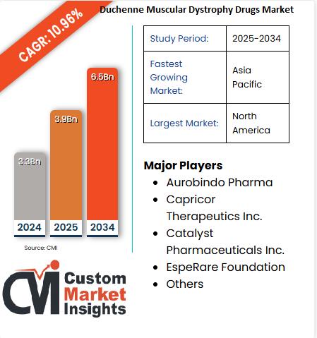 Global Duchenne Muscular Dystrophy Drugs Market size reached a value of USD 3.9 Billion in 2025. The market is expected to reach USD 6.5 Billion by 2034, exhibiting a growth rate (CAGR) of 10.96% during the forecast period 2025 - 2034.➤ Request Free Sample PDF Report @ https://www.custommarketinsights.com/request-for-free-sample/?reportid=67243