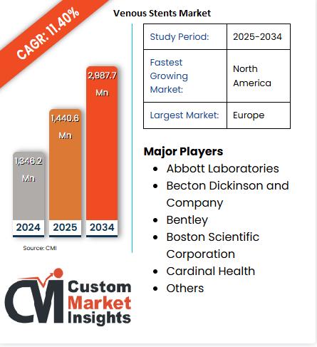 Global Venous Stents Market size was valued at USD 1,440.6 Million in 2025 and is projected to reach USD 2,987.7 Million by 2034, growing at a CAGR of 11.40% from 2024 to 2034 during the forecast period 2025 - 2034.