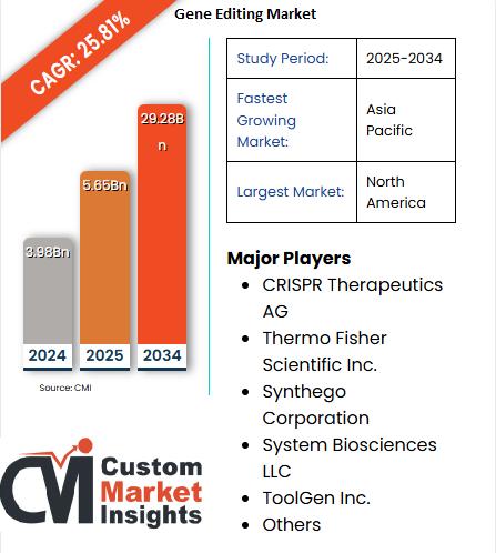 Global Gene Editing Market size was valued at USD 5.65 Billion in 2025. It is expected to reach USD 29.28 Billionin 2034, growing at a CAGR of 25.81% over the forecast period 2025 - 2034.