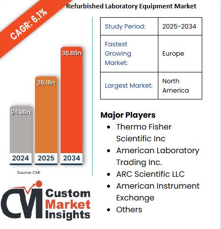 Global Refurbished Laboratory Equipment Market size was valued at USD 26.1 Billion in 2025. It is projected to grow at a CAGR of 6.1% from 2024 to 2034 and reach more than USD 38.6 Billion by the end of 2034, during the forecast period 2025 - 2034.