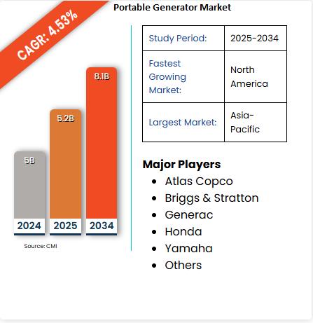 According to Custom Market Insights (CMI), the global Portable Generator market size was estimated at USD 5.2 Billion in 2025 and is anticipated to reach approximately USD 8.1 Billion by 2034, growing at a CAGR of around 4.53% during the forecast period from 2025 to 2034.