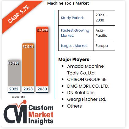 According to Custom Market Insights (CMI), the global Machine Tools Market size was estimated at USD 87.94 billion in 2023 and is anticipated to reach approximately USD 137.02 billion by 2030, registering a CAGR of around 5.7% during the period from 2023 to 2030.The continuous expansion of the global manufacturing industry, supported by rapid technological advancements such as multi-axis machining, CNC automation, robotics, and smart manufacturing systems, is a major contributor to the sustained growth of the machine tools market. These innovations are enhancing production accuracy, speed, and efficiency across industrial sectors.