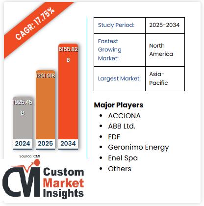 The Global Renewable Energy Market report delivers in-depth insights into historical performance, current valuation, and long-term growth prospects. It evaluates evolving market trends, competitive dynamics, policy influences, technological developments, and investment patterns shaping the renewable energy industry from 2025 to 2034.According to the study, the market accounted for approximately USD 1201.01 Billion in 2025 and is projected to expand at a CAGR of 17.75% during 2025-2034. The global renewable energy market is forecasted to reach nearly USD 6155.82 Billion by 2034, driven by global decarbonization goals and accelerating clean energy adoption.