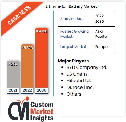 According to Custom Market Insights (CMI), The Lithium-Ion Battery Market size was estimated at USD 42.5 billion in 2021 and is anticipated to reach around USD 184.15 billion by 2030, growing at a CAGR of roughly 18.5% between 2022 and 2030.