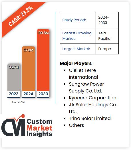 According to Custom Market Insights (CMI), the Global Floating Solar Panels Market was valued at USD 37.3 Million in 2024 and is expected to reach USD 190.6 Million by 2033, registering a strong CAGR of 23.3% during the forecast period 2024-2033.