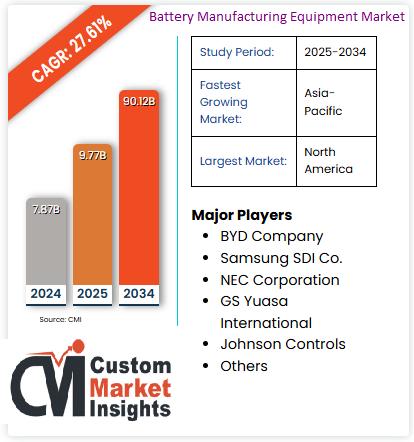 According to current market research conducted by the CMI Team, the global Battery Manufacturing Equipment Market is expected to record a CAGR of 27.61% from 2025 to 2034. In 2025, the market size is projected to reach a valuation of USD 9.77 Billion. By 2034, the valuation is anticipated to reach USD 90.12 Billion.