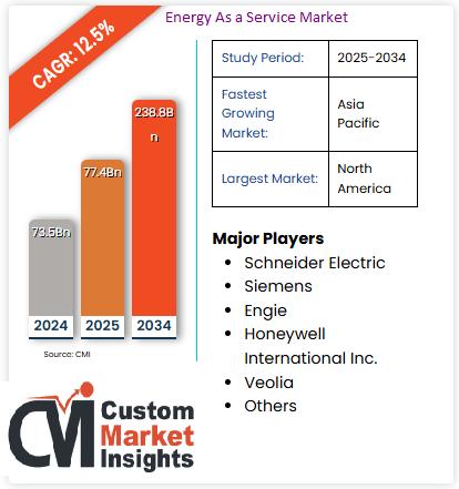 As per the current market research conducted by the CMI Team, the Global Energy As A Service Market size is expected to record a CAGR of 12.5% from 2025 to 2034. In 2025, the market size is projected to reach a valuation of USD 77.4 Billion. By 2034, the valuation is anticipated to reach USD 238.8 Billion.
