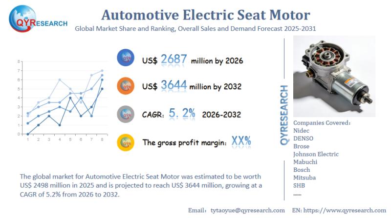 The global market for Automotive Electric Seat Motor was estimated to be worth US$ 2498 million in 2025 and is projected to reach US$ 3644 million, growing at a CAGR of 5.2% from 2026 to 2032.Global Leading Market Research Publisher QYResearch announces the release of its latest report "Automotive Electric Seat Motor - Global Market Share and Ranking, Overall Sales and Demand Forecast 2025-2031". Based on current situation and impact historical analysis (2020-2024) and forecast calculations (2025-2031), this report provides a comprehensive analysis of the global Automotive Electric Seat Motor market, including market size, share, demand, industry development status, and forecasts for the next few years.