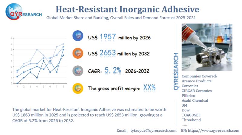 The global market for Heat-Resistant Inorganic Adhesive was estimated to be worth US$ 1863 million in 2025 and is projected to reach US$ 2653 million, growing at a CAGR of 5.2% from 2026 to 2032.