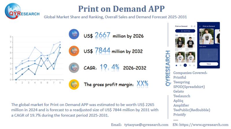 The global market for Print on Demand APP was estimated to be worth US$ 2265 million in 2024 and is forecast to a readjusted size of US$ 7844 million by 2031 with a CAGR of 19.7% during the forecast period 2025-2031.Global Leading Market Research Publisher QYResearch announces the release of its latest report "Print on Demand APP - Global Market Share and Ranking, Overall Sales and Demand Forecast 2025-2031". Based on current situation and impact historical analysis (2020-2024) and forecast calculations (2025-2031), this report provides a comprehensive analysis of the global Print on Demand APP market, including market size, share, demand, industry development status, and forecasts for the next few years.