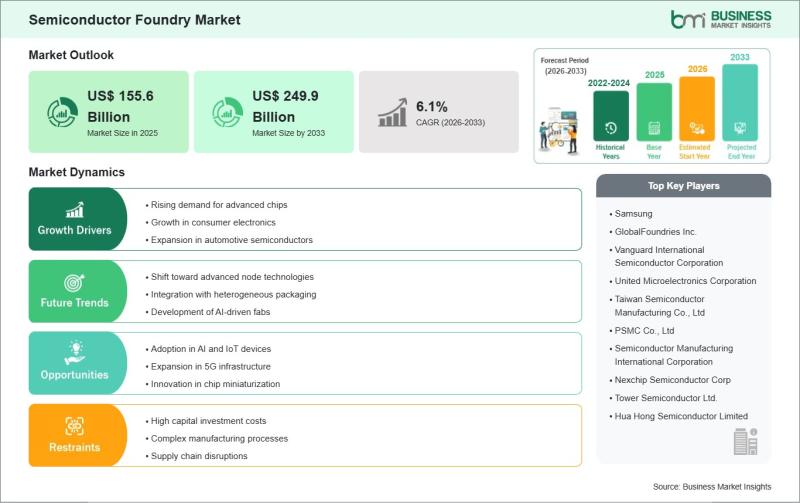 According to The Insights Partners Global Semiconductor Foundry Market a leading market research and content strategy firm, today announced key findings from its latest industry analysis revealing explosive growth in the global Semiconductor Foundry Market. The market, valued at US$ 155.6 billion in 2025, is projected to reach US$ 249.9 billion by 2033, demonstrating a robust compound annual growth rate (CAGR) of 6.10% from 2026 to 2033.Download Sample Report - https://www.businessmarketinsights.com/sample/BMIPUB00032471