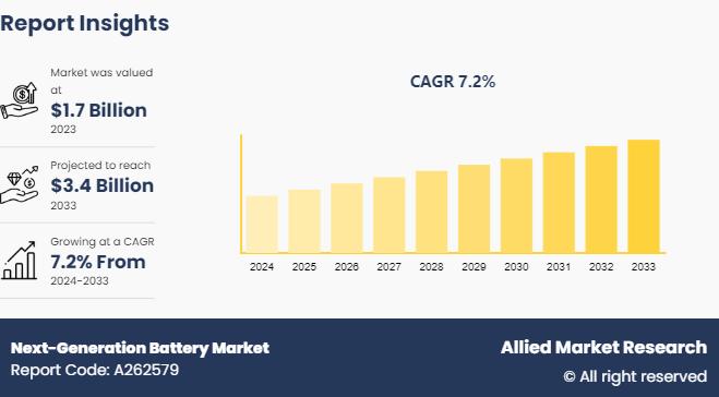 The global next-generation battery market is gaining strong momentum as industries worldwide seek advanced energy storage solutions to support electrification, renewable integration, and digital infrastructure expansion. Valued at $1.7 billion in 2023, the market is projected to reach $3.4 billion by 2033, growing at a CAGR of 7.2% from 2024 to 2033.