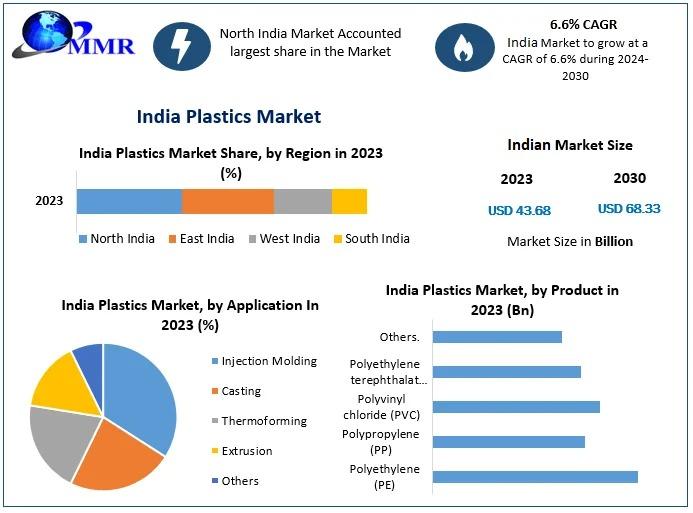 India Plastics Market was worth US$ 43.68 Bn in 2023 and total revenue is expected to grow at a rate of 6.6% CAGR from 2024 to 2030, reaching almost US $ 68.33 Bn in 2030.The India Plastics Market is witnessing a strategic transformation as sustainability goals, advanced manufacturing practices, and rising domestic demand reshape the industry landscape. Plastics continue to play a vital role across packaging, automotive, construction, healthcare, agriculture, and consumer goods, supporting India's expanding industrial ecosystem and urban development needs.