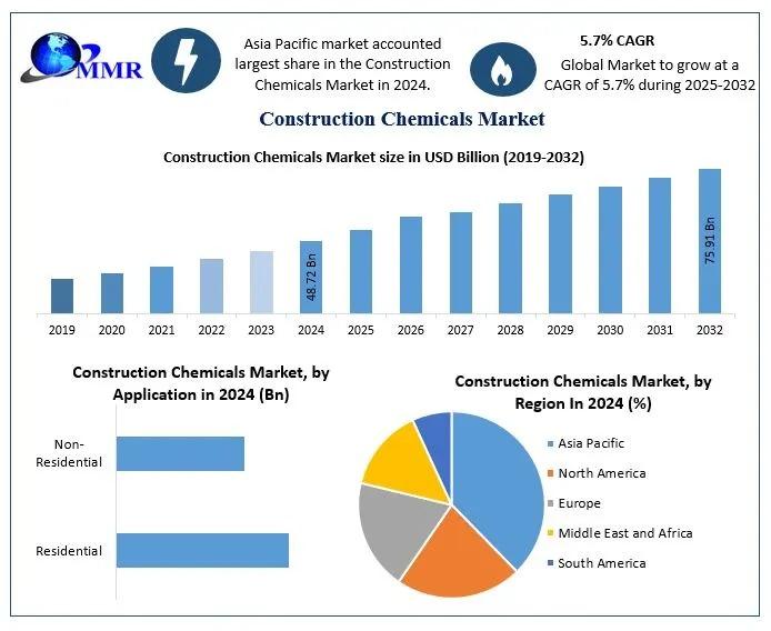 The Construction Chemicals Market size was valued at USD 48.72 Billion in 2024 and the total Construction Chemicals revenue is expected to grow at a CAGR of 5.7% from 2025 to 2032, reaching nearly USD 75.91 Billion.The Construction Chemicals Market is gaining strong momentum as infrastructure modernization, urban expansion, and sustainability-focused construction practices accelerate worldwide. Construction chemicals are specialized formulations used to enhance strength, durability, bonding, and longevity of structures, making them indispensable across residential, commercial, and industrial projects.