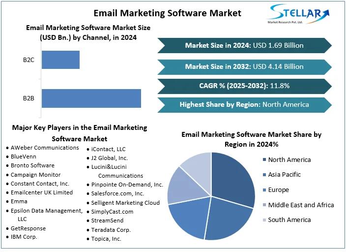 Email Marketing Software Market size was valued at USD 1.69 Bn. in 2024 and the Email Marketing Software revenue is expected to grow by 11.8% from 2025 to 2032, reaching nearly USD 4.14 Bn.The email marketing software market is a core segment of the global digital marketing and marketing automation industry. Email marketing software enables businesses to design, send, automate, and analyze email campaigns to engage customers, generate leads, and drive sales. These platforms offer features such as email templates, contact management, segmentation, personalization, automation workflows, analytics, and integration with customer relationship management and e commerce systems.