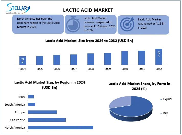 Lactic Acid Market is rising at a CAGR of 8.12% and is valued at USD 4.13 Bn. in 2024, fueled by eco-packaging and skincare innovation, reaching nearly USD 7.71 Bn. by 2032