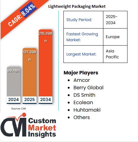 Global Lightweight Packaging Market size was valued at USD 107.39 Billion in 2025 and expected to reach USD 215.39 Billion by 2034, at a CAGR of 8.04% during the forecast period 2025 - 2034.