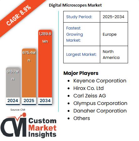 Global Digital Microscopes Market size is expected to reach USD 1,289.6 Million by 2034, from USD 675.4 Million in 2024, exhibiting a compound annual growth rate (CAGR) of 8.9% from 2025- 2034.➤ Request Free Sample PDF Report @ https://www.custommarketinsights.com/request-for-free-sample/?reportid=67355