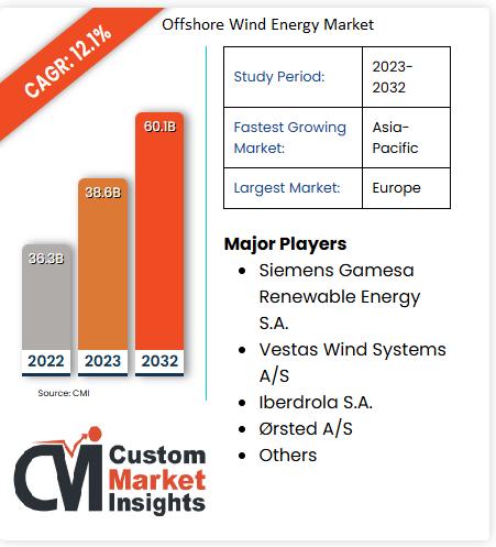 As per the current market research conducted by the CMI Team, the global Offshore Wind Energy Market is projected to grow at a CAGR of 12.1% from 2023 to 2032. The market valuation was USD 36.3 billion in 2022 and is expected to reach USD 60.1 billion by 2032, driven by technological advancements, government incentives, and increasing global renewable energy demand.