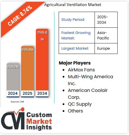 According to Custom Market Insights, the global agricultural ventilation market size was valued at approximately USD 936.8 million in 2025 and is projected to reach nearly USD 2,165.8 million by 2034, growing at a CAGR of about 8.74% during the forecast period from 2025 to 2034. The market assessment evaluates key growth drivers, restraints, and their influence on demand patterns while also highlighting emerging global opportunities.