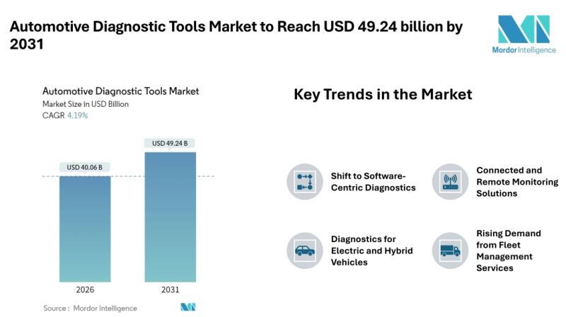 According to insights from Mordor Intelligence, automotive diagnostic tools market size [https://www.mordorintelligence.com/industry-reports/automotive-diagnostic-tools-market?utm_source=abnewswire] in 2026 it is estimated at $40.06 billion, growing from 2025 value of $38.45 billion with 2031 projections showing USD 49.24 billion, growing at 4.19% CAGR over 2026-2031.