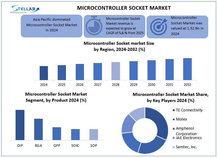 Microcontroller Socket Market size was valued at USD 1.52 Bn. in 2024, and the total Microcontroller Socket Market revenue is expected to grow at a CAGR of 5.6 % from 2025 to 2032, reaching nearly USD 2.35 Bn.