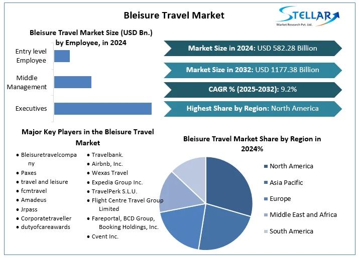 The Bleisure Travel Market size was valued at USD 582.28 Bn. in 2024 and the total Global Bleisure Travel revenue is expected to grow at a CAGR of 9.2% from 2025 to 2032, reaching nearly USD 1177.38 Bn. by 2032.
