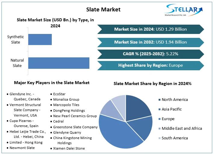 Slate Market size was valued at USD 1.29 Bn. in 2024 and the total Slate revenue is expected to grow at a CAGR of 5.22% from 2025 to 2032, reaching nearly USD 1.94 Bn. by 2032.
