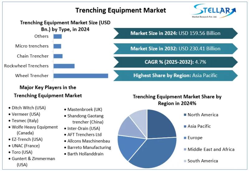 The Trenching Equipment Market size was valued at USD 159.56 Bn. in 2024 and the total Global Trenching Equipment Market revenue is expected to grow at a CAGR of 4.7% from 2025 to 2032, reaching nearly USD 230.41 Bn.