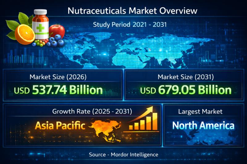 Global Nutraceuticals Market OverviewThe global nutraceuticals market continues to expand as consumers increasingly adopt preventive healthcare and functional nutrition solutions. According to Mordor Intelligence, the nutraceuticals market size is expected to grow from USD 513.20 billion in 2025 to USD 537.74 billion in 2026, and further reach USD 679.05 billion by 2031, registering a CAGR of 4.78% during 2026-2031.