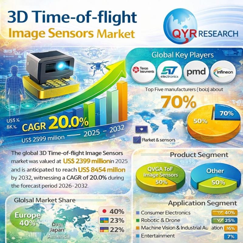 Pune, India: The global 3D Time-of-flight Image Sensors market is brilliantly evaluated in the research study that explores vital aspects such as market competition, segmentation, revenue and production growth, and regional expansion. The authors of the report have provided a thorough assessment of the global 3D Time-of-flight Image Sensors market on the basis of CAGR, sales, consumption, price, gross margin, and other significant factors. We have studied key players of the global 3D Time-of-flight Image Sensors market, taking into account their recent developments, geographical market growth, footprint, market expansion, production, and areas served. Our key findings and recommendations have proven quite helpful for both established and new players in the global 3D Time-of-flight Image Sensors market.The global 3D Time-of-flight Image Sensors market was valued at US$ 2399 million in 2025 and is anticipated to reach US$ 8454 million by 2032, witnessing a CAGR of 20.0% during the forecast period 2026-2032.