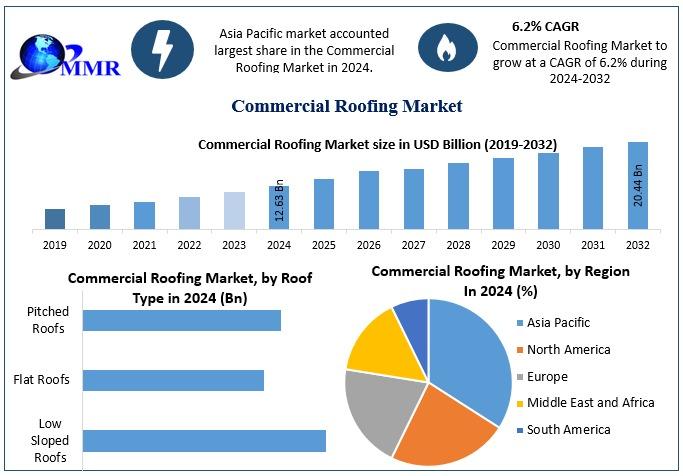 Commercial Roofing Market was valued nearly US$ 12.63 Bn in 2024. Commercial Roofing Market size is estimated to grow at a CAGR of 6.2 % & is expected to reach at USD 20.44 Bn. by 2032.