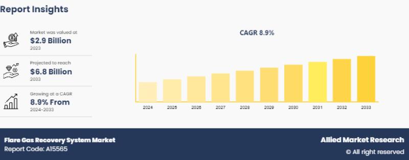 The global flare gas recovery system market was valued at USD 2.9 billion in 2023 and is projected to reach USD 6.8 billion by 2033, growing at a robust CAGR of 8.9% from 2024 to 2033. The market growth is primarily driven by increasing environmental regulations, rising focus on reducing gas flaring, and growing demand for energy efficiency across oil & gas and industrial sectors.