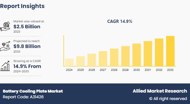 According to a new industry analysis, the global battery cooling plate market size was valued at $2.5 billion in 2023 and is projected to reach $9.8 billion by 2033, registering a strong CAGR of 14.9% from 2024 to 2033. The rapid growth of electric vehicles (EVs), rising deployment of energy storage systems, and increasing focus on battery safety and performance are the key factors accelerating market expansion.